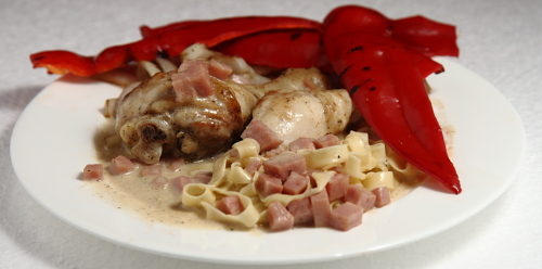 I plated the chicken with a little ham and sauce, the (grilled) pepper and onions. I left most of the sauce in the pan. During the time the ham was cooking in the pan, I’d cooked the pasta. Since it was dried it needed to boil slightly longer than when made fresh. I drained the pasta, then added it to the pan with the cream sauce, stirred the sauce in, plated the pasta and divided all the remaining sauce over both plates.