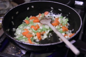 The actual cooking process starts with the meat sauce. I grind my own meat, so I started off grinding the beef on a coarse setting. Chop the onion, garlic, celery and carrot in small pieces. Add some butter and olive oil to a pan and when the butter has melted, add the chopped vegetables. Cook the vegetables in the butter and oil for about 5 minutes, until they slightly start to soften. Add the ground beef. When the beef is about cooked, add the white wine. When the liquid has almost completely evaporated add about half the passata di pomodori, a pinch of salt, some fresh ground pepper and a pinch of Italian seasoning. Cover and let it simmer for 15 minutes or so.Now, for the extra-extra tastyness, grab your food grinder, still on the course setting, and put the sauce through the grinder. It will then become a very fine grind of meat, with all the veggies mixed in. (You can’t even see the vegetables anymore, so if you have picky non-veg-eaters, this is the way to give them their vitamins!)