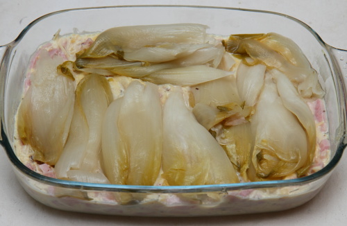 The way I prepare chicory is derived from the way my mom does. She’d usually serve it, boiled, then rolled into slices of ham with cheese on top, from the oven. She’d usually serve boiled potatoes and some kind of meat and gravy with it. I’ve served it that way before, but during my single years it’s evolved to an all-in-one oven dish. A casserole without side dishes. I don’t have one fixed recipe for it, but generally it’ll be mashed potatoes, chicory, ham, cheese and egg. Add some herbs and it’s done.