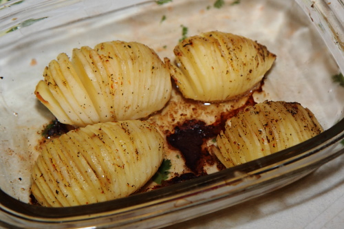 I still promised you all the recipe for my fancy-schmancy potatoes. I got the idea and the cutting technique from Kayotic Kitchen. I then rolled with it and made it my own. I hope you like them!